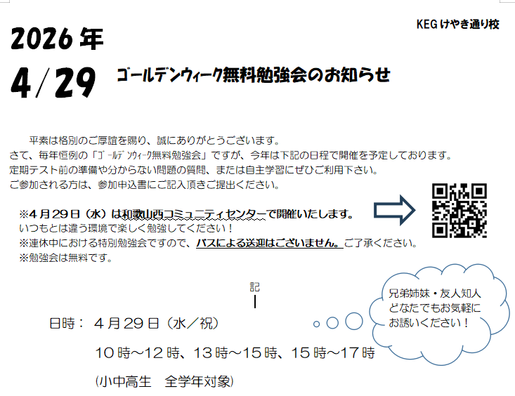 2025年5月9日 / 最終更新日時 : 2025年5月9日 keyaki 未分類 定期テスト質問対応受付中!! 続々とテスト発表が始まっています! 自学自習でお困りの方! ぜひ校舎までお越しください!!